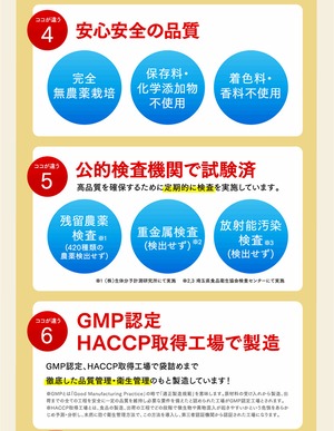 A:本品は国内のGMP認定・HACCP取得工場にて、厳しい品質管理基準のもと製造されています。原料の受け入れから製品の出荷まで、衛生管理や工程管理を徹底しています。