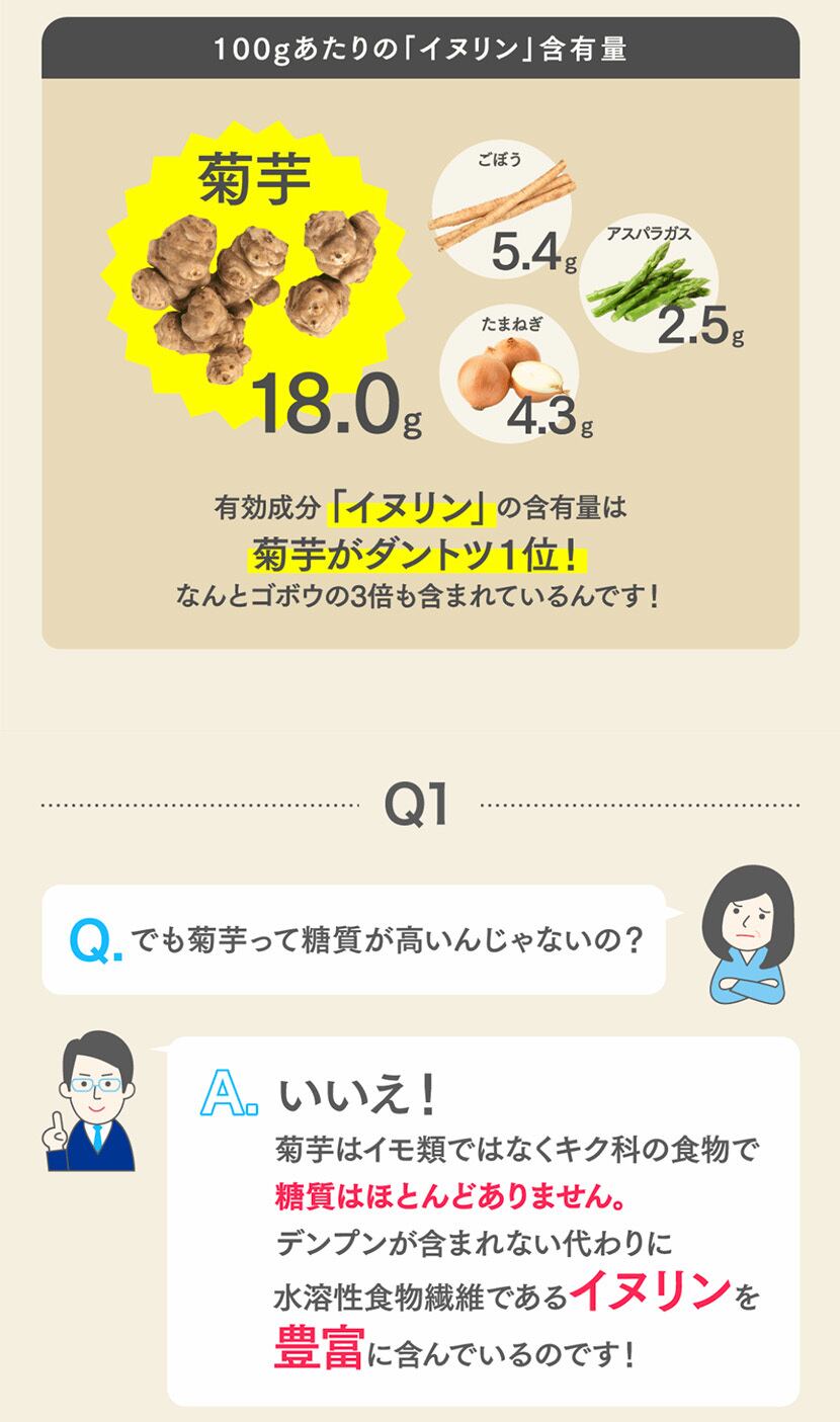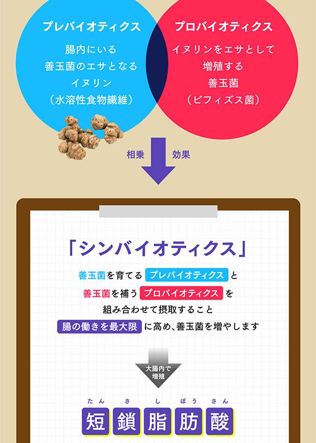 菊芋に多く含まれる水溶性食物繊維「イヌリン」は、腸内で善玉菌のエサとなる“プレバイオティクス”の代表的な成分です。